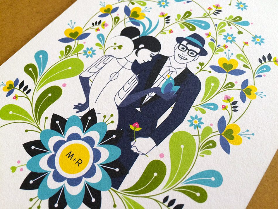 Inspiré par les motifs suédois traditionnels mais surtout par la personnalité des mariés, le faire part de mariage se veut être un portrait bucolique, romantique et floral.